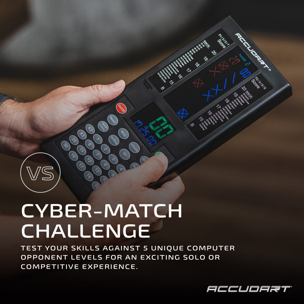 The Accudart Cybermatch 2000 Electronic Dart Scorer brings advanced scoring and exciting gameplay to your steel tip dart matches. With 32 built-in games and 580 variations, this scorer offers endless entertainment for solo players or groups of up to 8. Challenge yourself with 5 computer difficulty levels in Cybermatch mode, perfect for sharpening your skills or adding competitive tension. The vertical X/O cricket display ensures clear, easy-to-read scoring for everyone, while the battery-operated design (3 AA, not included) lets you take the action anywhere. Whether you're hosting a game night or practicing alone, the Cybermatch 2000 makes keeping score effortless and fun.