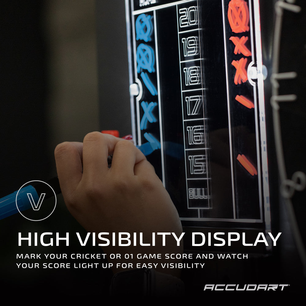- HIGH-VIS DISPLAY – Mark your cricket or 01 game score with the included markers and watch your score light up for easy visibility from any distance