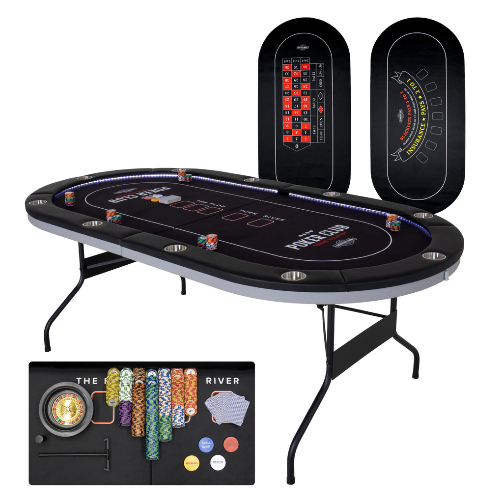 Bring the excitement of casino night home with the 84" Oval LED Casino Table, designed to seat up to 10 players with individual built-in cup holders for each spot. Its smooth, professional-grade poker mat ensures optimal card glide and chip control, while integrated LED lighting adds the perfect ambiance for late-night games. Durable metal legs offer a sturdy base during play and fold down easily for compact storage—ideal for game rooms, basements, or garages. The table includes everything you need to get started, including a full poker chip set and bonus 6.5" roulette wheel, so you're ready to deal right out of the box.
