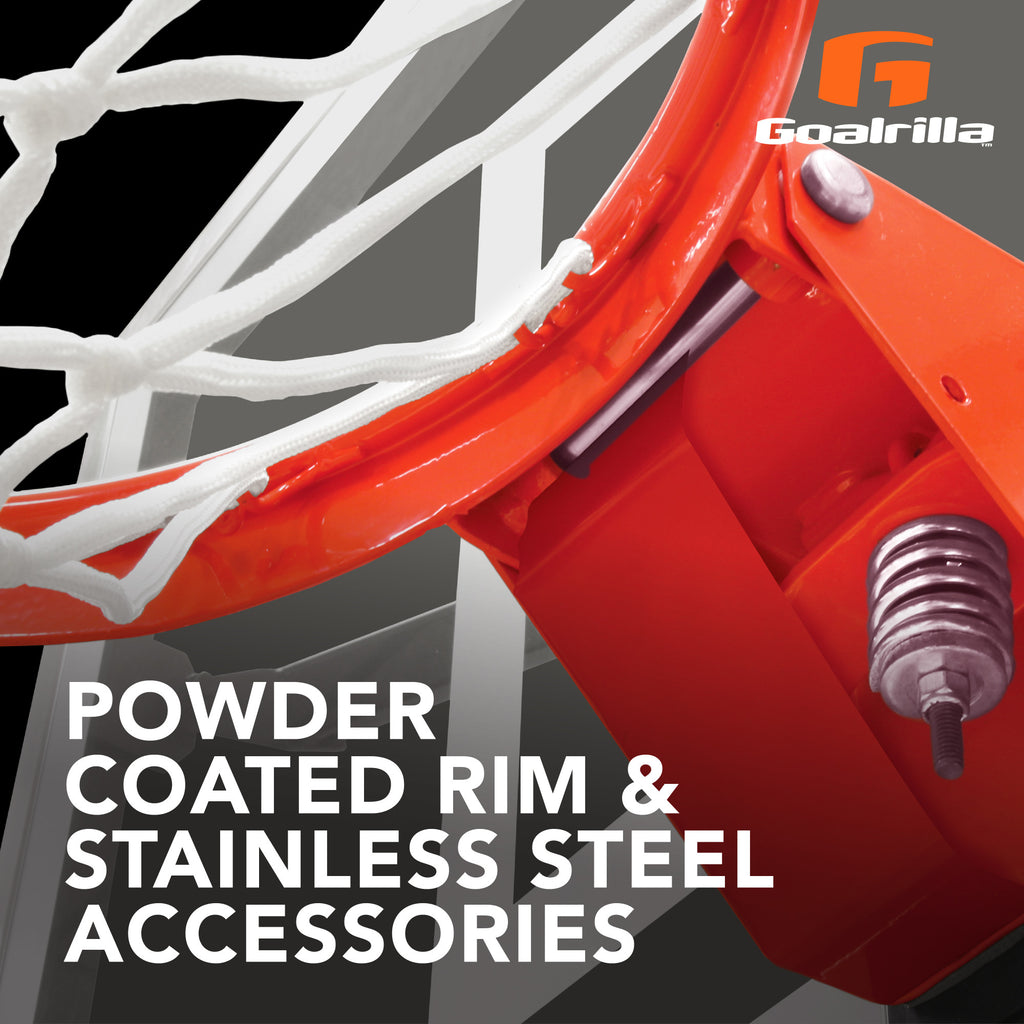 It is the most abused aspect of a basketball hoop. And we don't take that lightly. Nobody builds breakaway basketball rims like Goalrilla. Our basketball rims are built to the highest levels of safety and durability. And they are just one more example of our dedication to building the toughest basketball goals on the planet. Each Goalrilla basketball rim utilizes all-steel strength and stainless steel components while being protected from the elements with a durable powder coat finish. This rim fits Goalrilla basketball hoop systems with a 3" x 4" or 4" x 4" bolt pattern and fits all Goaliath and Silverback glass backboard basketball systems. This rim is compatible with the following hoops: CV54, GS60c, GS54c, GS54, SB60, SB60 Ghost, SB54, SB54iG, Ignite, Prodigy, Warrior, SBX60, SBX54, and SBX54iG. This listing does NOT include a basketball backboard and only includes a rim and net. Our basketball rims have what it takes to be Goalrilla tough.