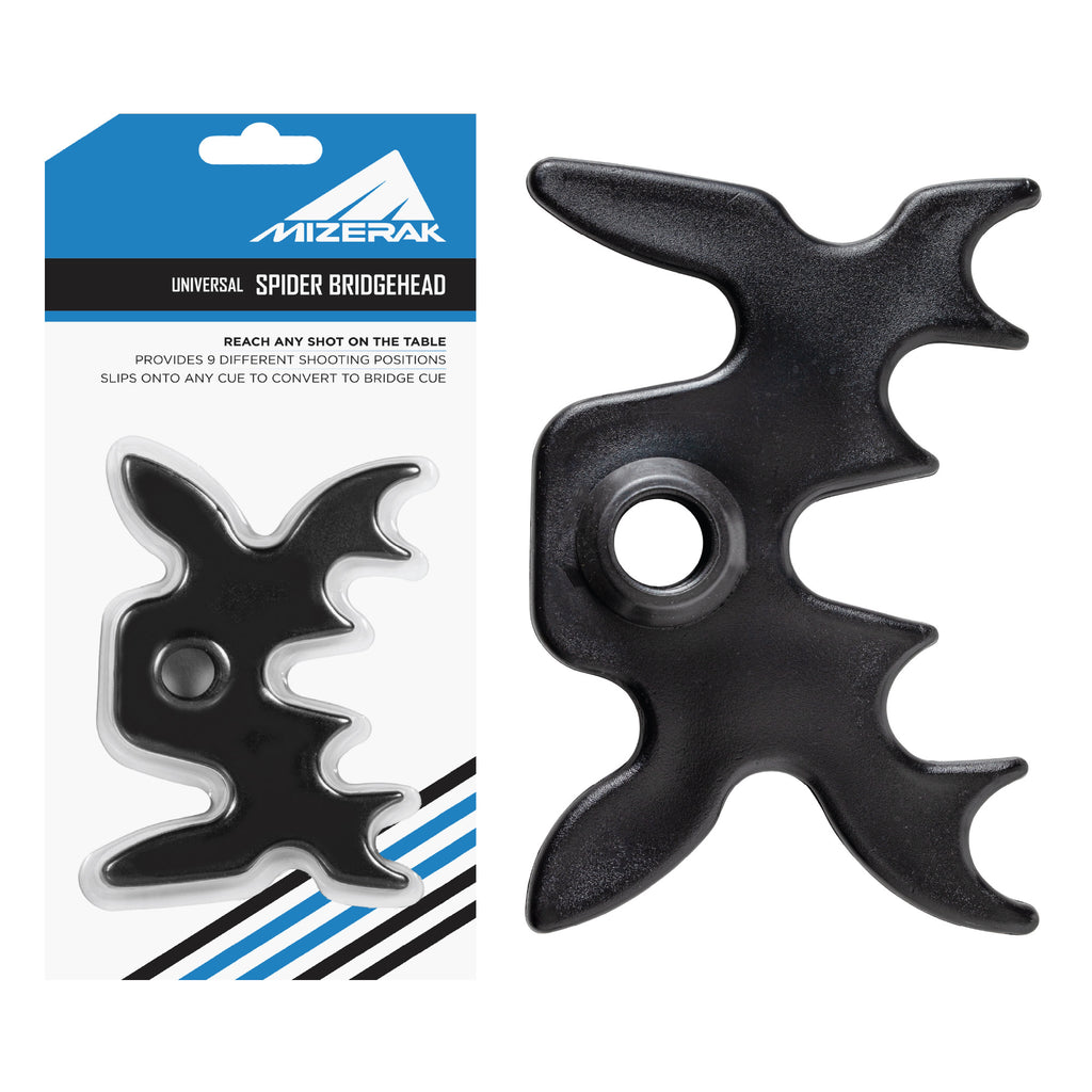 The Mizerak Bridgehead is a versatile tool designed to enhance your game by providing up to 9 different shooting positions. This spider bridgehead easily slips over any pool cue, transforming it into a bridge stick to reach difficult shots. It features a rubber grommet to protect your cue ferrule from scratches and is compact enough to fit into your cue case or pocket, making it highly transportable. Ideal for players seeking precision and convenience in their game.