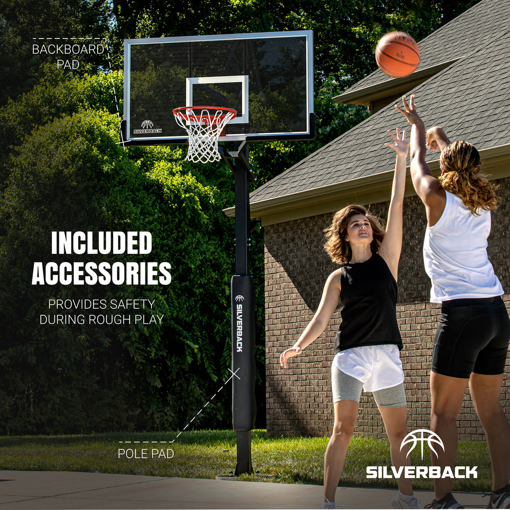 All-new to Silverback’s incredible line of basketball goals, the brand new 60-inch Ghost basketball goal features a tinted tempered glass backboard to reduce the sun’s glare while delivering pro-style rebound performance. This basketball goal offers a revolutionary anchor bolt mounting system allowing you the option to unbolt and relocate your system if you move homes. The Ghost uses a crank actuator to adjust the goal from the NBA and NCAA regulation height of 10 feet to safety-approved height of 7.5 feet. Included in your purchase, the Ghost comes complete with a pole pad and backboard pad to offer protection during lay-ups and a break-away rim that flexes under pressure. Backed by a 5-year limited warranty, the Silverback Ghost takes hoops to the next level.