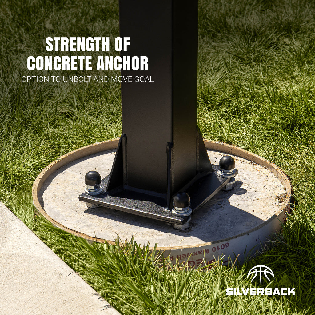 - OPTION TO UNBOLT AND MOVE GOAL — Anchor mounting offers the strength of concrete and the option to unbolt and move in-ground basketball goal
