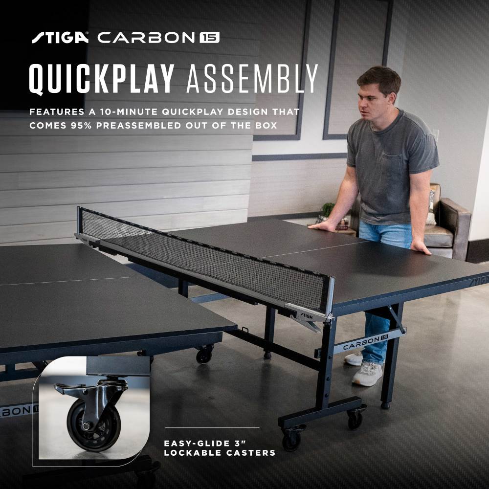 The STIGA Carbon 15 is built for players who want tournament-ready performance with sleek, modern style. Its 15mm-thick tabletop features multiple roller coat finishes and silk-screen striping for a consistent bounce, while upgraded 3" lockable casters offer smoother rolling and secure placement. QuickPlay design allows for 10-minute assembly out of the box, and playback mode lets you sharpen your skills solo. Built-in ball holders on each end keep three balls within easy reach, and carbon fiber-style leg accents give the Carbon 15 a bold, high-performance look. Complete with a 72" clamp-style net and post set, this table delivers serious play with standout design.