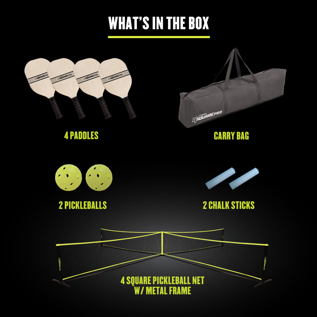 - PRO UPGRADED PICKLEBALL SET – Built for competitive play with higher density paddles, a tear-resistant net, reinforced nylon connectors, and a 36" net height for four square regulation matches.